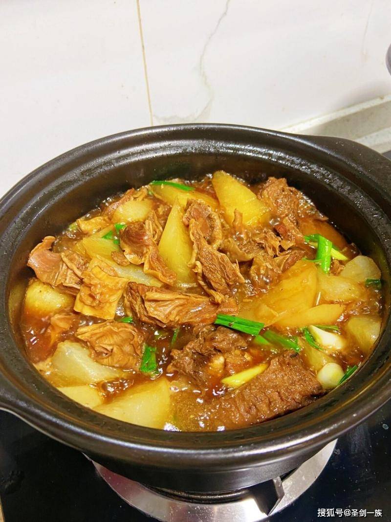 4、时间到,再倒入白萝卜焖煮半个小时。炖煮至牛腩和萝卜软烂,夹出香料,开大火翻炒收汁,撒上葱花即可出锅开吃。