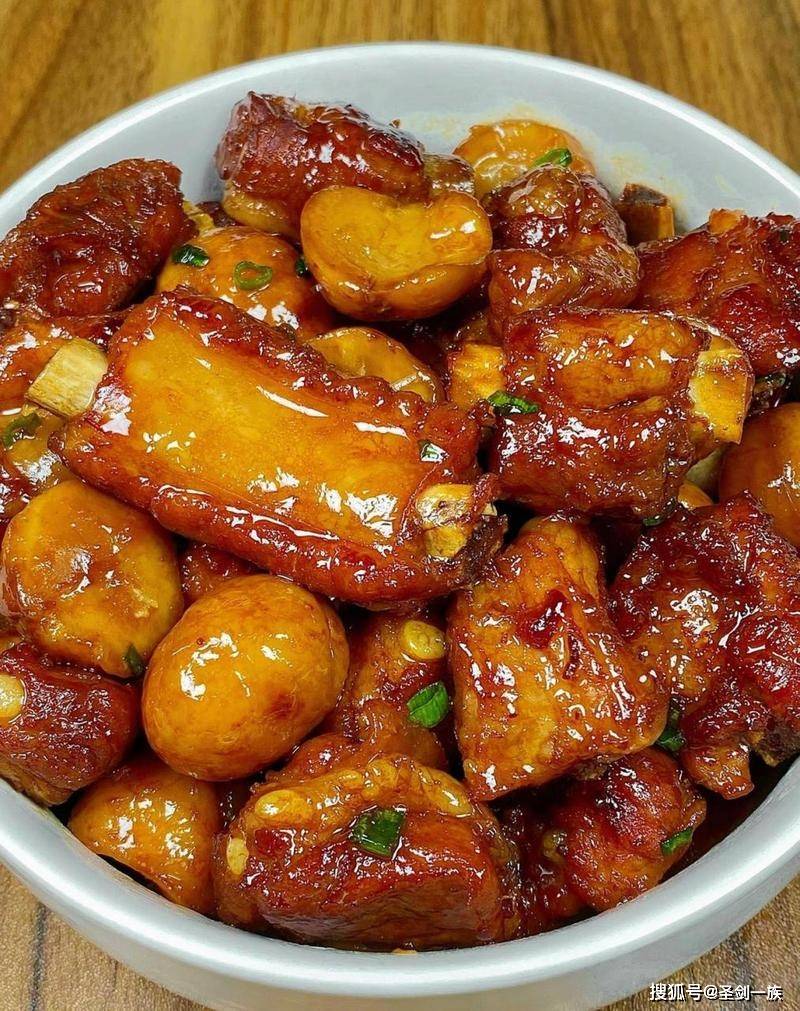 4、时间到,再放入板栗,继续焖煮二十分钟。煮好后,开大火翻炒收汁,撒上白芝麻即可出锅装盘开吃。