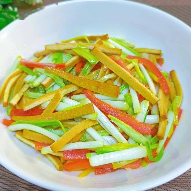 ②取出1个红辣椒,洗干净后切成丝。把80克的香干洗干净,切成丝。