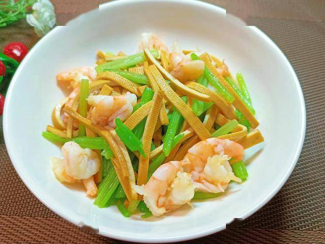 ④热锅冷油,倒入大虾炒。虾仁微微变红色时放入芹菜和香干,爆炒一会儿加少许的盐调味,翻炒均匀后就可以出锅了。