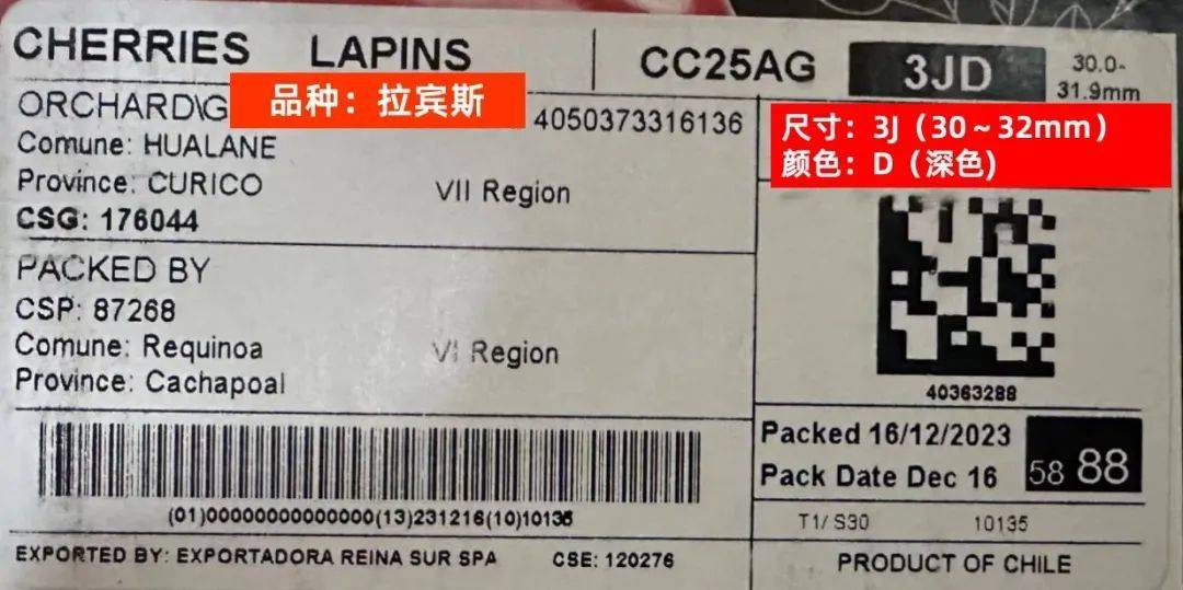 为了买的合适又好吃,我们在购买时候,需要关注车厘子原装盒上的标签。 (*分箱可能没有标签,需咨询卖家获得)