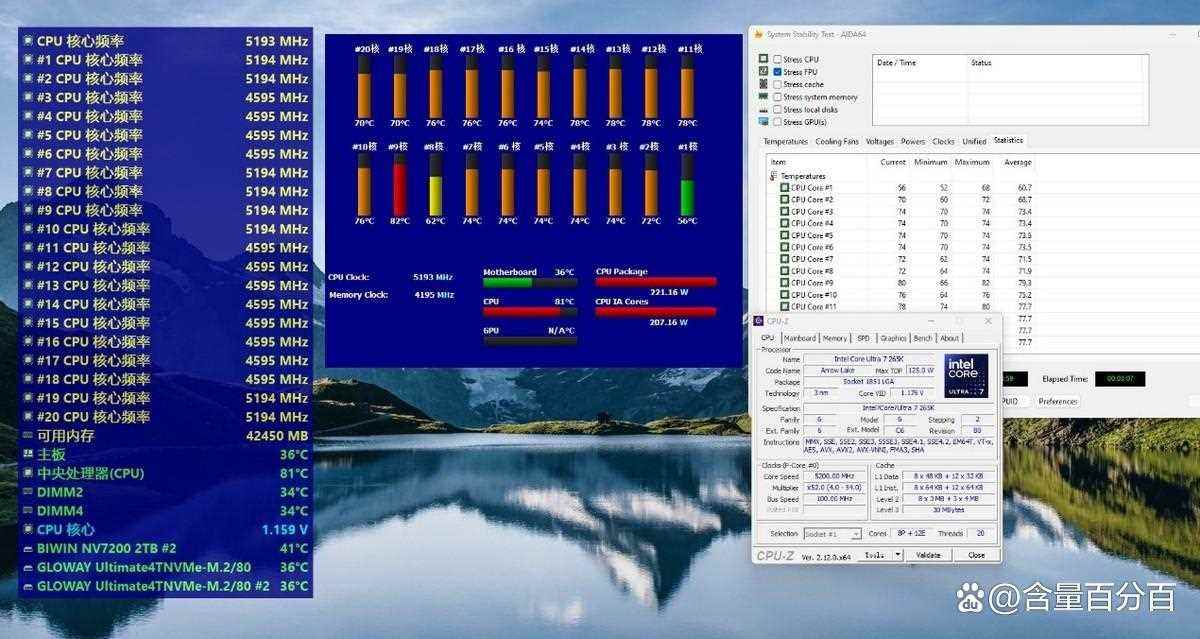 测试前通过官方驱动将酷睿Ultra 265K的P核锁定在5.2GHz,E核锁定在4.6GHz,开启AIDA 64 FPU进行压力测试,测试时间保持在3分钟7秒。下面我们先来看看搭配硅脂时的测试结果,单核最高温度为84摄氏度,最低温度62摄氏度,其中80摄氏度以上的核心数量为9个,CPU对应功耗达到了241.9W。