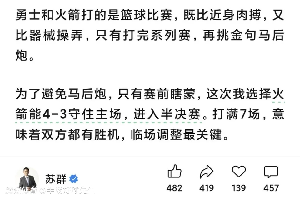 一旦巴特勒站出来,那么火箭还是凶多吉少,所以要想击败勇士,火箭要考虑同时防住库里和巴特勒,毕竟季后赛的巴特勒可不好惹。说来说去尽管苏群老师排除了这一点,但火箭没有巨星确实是个隐患,打到关键时刻该靠谁?杰伦格林稳定性差,申京经常不靠谱,范弗里特时灵时不灵,贾巴里也是不稳定,阿门和伊森都是偏重于防守,进攻端缺乏爆发力,如此来看火箭要尽量在前面拉开分差,以免被勇士拖到关键时刻。