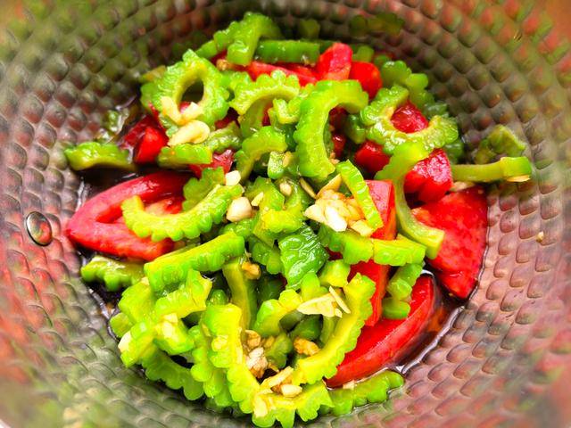 主要食材:苦瓜1个,番茄1个,大蒜2个,生抽1勺,陈醋1勺,白糖1勺,味精1勺,香油1勺,盐1小勺