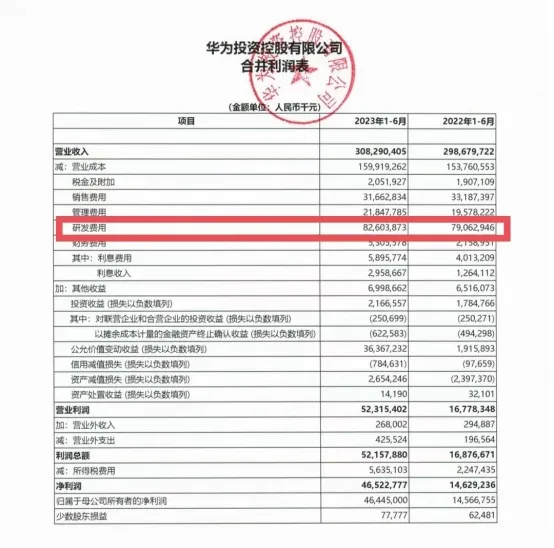 8月30日,华为在上清所官网披露2023年半年报。上半年,华为实现营收3082.90亿元,上年同期为2986.80亿元;净利润为465.23亿元,上年同期为146.29亿元。值得注意的是,2023年上半年,华为研发费用为826.04亿元,同比增加35.41亿元,上年同期为790.63亿元。